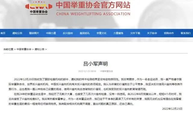 就在今日,中国举重协会发布吕小军声明,表示无动机使用兴奋剂,将配合调查还自己清白: