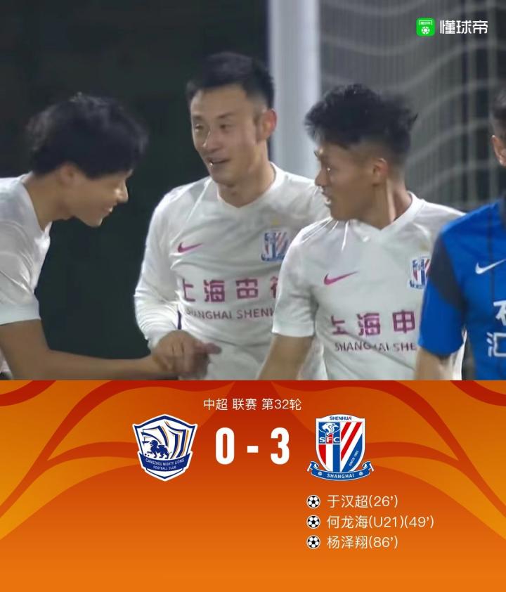北京时间12月23日20:00,中超第32轮,沧州雄狮对阵上海申花。本场比赛地点是海口观澜湖足球基地,戴弋戈执法,VAR是杜健鑫。上半场比赛,汪海健变线破门被吹无效,于汉超抓住对方失误得分;下半场,小将何龙海补射建功,周俊辰倒钩打门可惜踢飞,杨泽翔再下一城锁定胜局。最终申花3-0力克沧州。