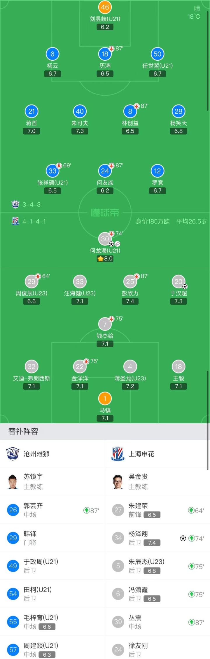 上海申花首发:1-马镇、4-蒋圣龙(U23)、32-艾迪-弗朗西斯、7-钱杰给(74'5-朱辰杰(U23))、18-王毅、20-于汉超、22-金洋洋(75'6-冯潇霆)、25-彭欣力(88'39-丛震)、29-周俊辰(U23)(64'27-朱建荣)、30-何龙海(U23)(74'34-杨泽翔)、33-汪海健(U23)