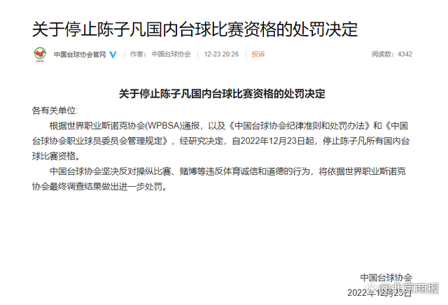 中国台球协会官网官方宣布,根据世界职业斯诺克协会(WPBSA)通报,以及《中国台球协会纪律准则和处罚办法》和《中国台球协会职业球员委员会管理规定》,经研究决定,自2022年12月23日起,停止陈子凡所有国内台球比赛资格。