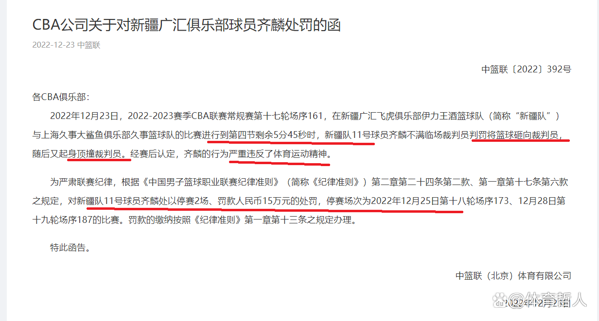 昨天,CBA公司可以说是收入很大,先是给新疆队球员齐麟开出了一份大罚单,停赛2场+罚款15万元。原因是齐麟在与上海队的比赛中发生了很不理智的行为,在第四节比赛还有5分45秒时,因为不满裁判吹罚,直接怒骂裁判,并且,还拿起篮球直接砸向裁判,导致场面一度失控。旁边的王哲林,看到这种情况,也是一脸不可思议。
