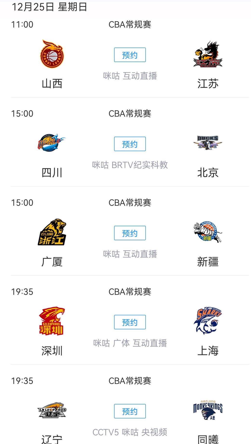 而明天也就是12月25日,CBA将继续第18轮比赛的争夺,共有五场大战即将展开,分别是山西对战江苏、四川对战北京、广厦对战新疆、上海对战深圳、辽宁对战同曦。