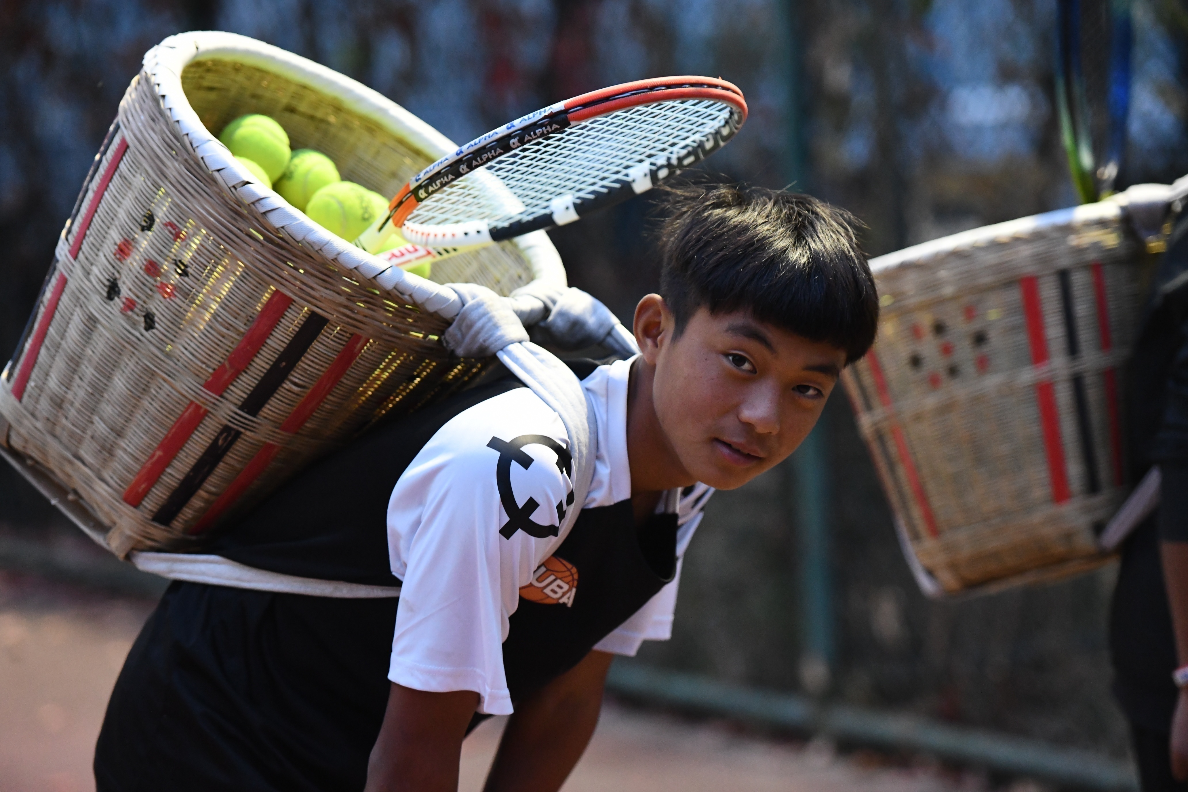 身着蓝色网球T恤的少年背着背篓笑着走上赛场……