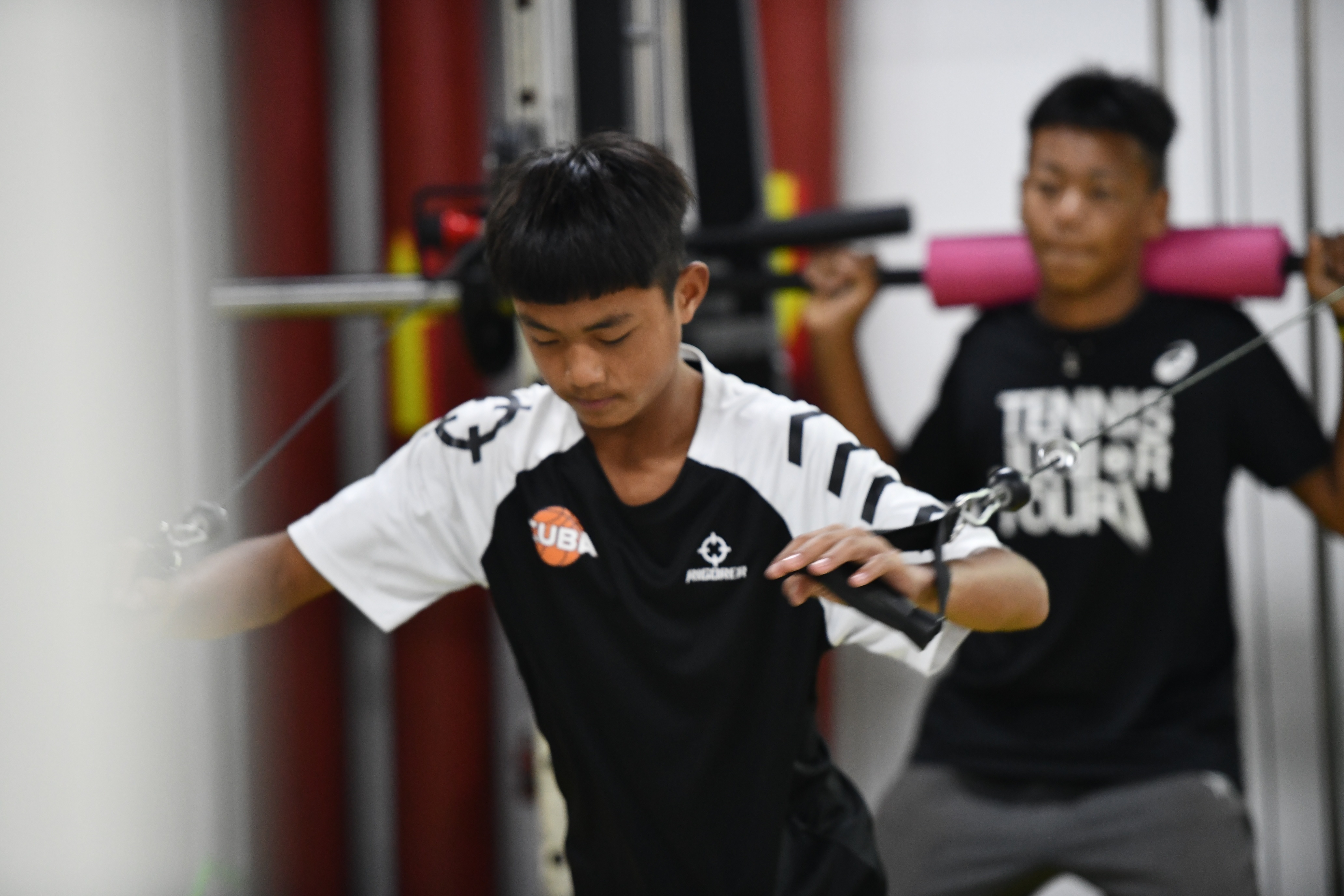 王发和队友正在廊坊市野象俱乐部训练室进行训练。 郑晨子 摄