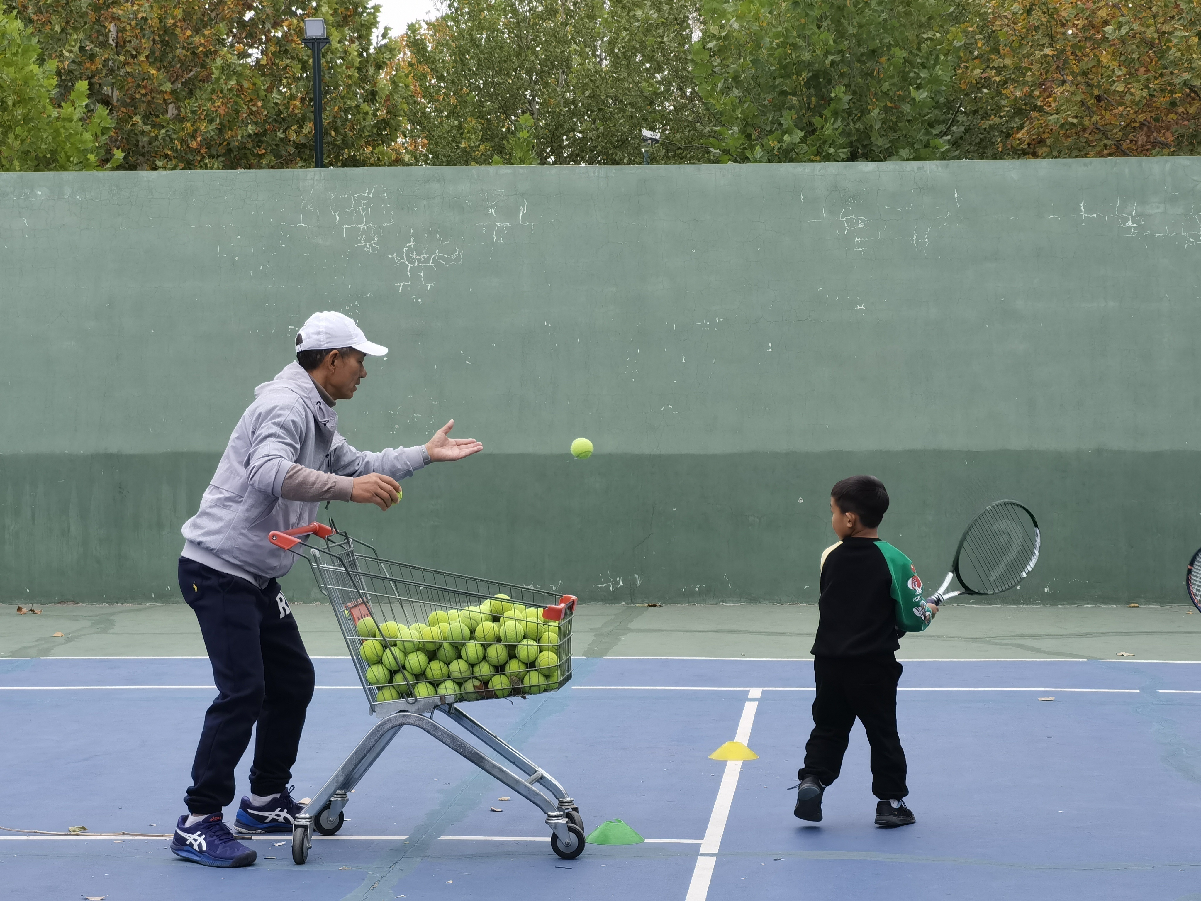 王发背着背篓在廊坊市体育馆附近的网球场参加训练。 郑晨子 摄