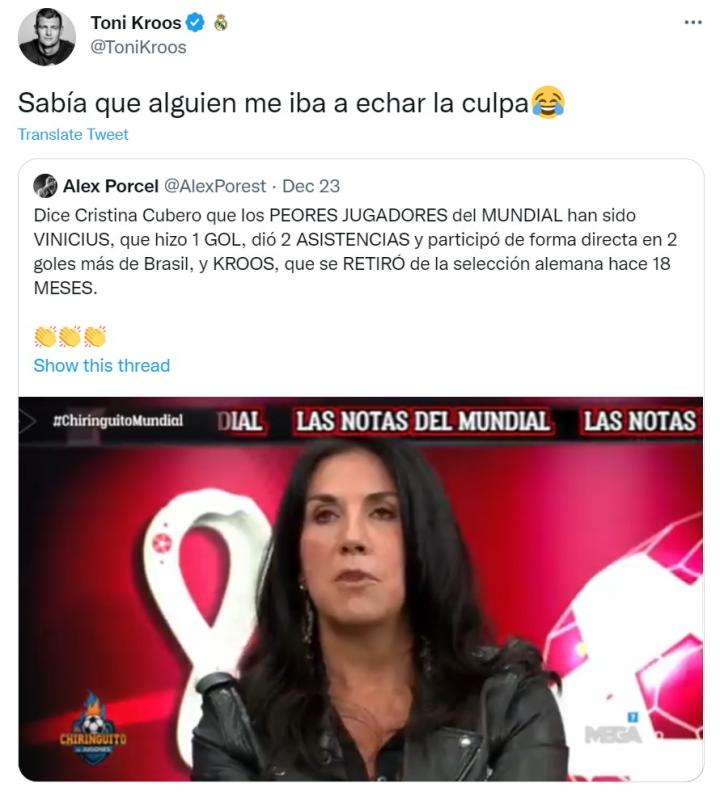 西班牙主持人Cristina Cubero在节目中表示克罗斯应该被评为本届世界杯最差球员之一,因为他18个月前从国家队前退役导致了德国队小组出局。