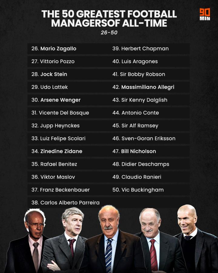 知名足球媒体90min评选了最新的历史50大主帅,弗格森爵士居首,萨基、米歇尔斯分列第2、3位。