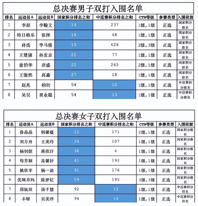 双打入围名单同样强者云集,众多名将选择双线作战。男子双打方面,老将李喆将与今年在国际赛场上表现出色的小将李翰文搭档,成为头号种子。特日格乐则与张择搭档,位列二号种子。此外,柏衍和赵兆的“师徒”组合、吴昊和莫业聪的“师兄弟”组合也值得关注。