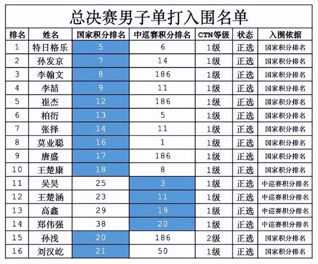 男子单打的参赛名单由去年赛会亚军特日格乐领衔。特日格乐今年在国外连续征战,拿到一个ITF赛事的冠军,世界排名已升至561位。作为2021年CTA1000长沙望城站的男单冠军,他将以头号种子征战本次总决赛。而今年CTA1000长沙望城站双冠王莫业聪在经过国际赛场磨砺之后,也将亮相澳门,这位极具潜力的新秀将力争延续自己本赛季的连胜。此外,李喆、张择、柏衍三位前中国一哥亦将出战总决赛,与年轻人们斗智斗勇。