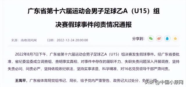 12月24日晚,广东省纪委监委发布通报,认定8月份发生在省运会上的一场足球决赛系假球,对16名党员领导干部严肃问责。其中,广东省体育局局长王禹平、省体育局副局长雷检军、广州市体育局局长欧阳资文、清远市文化广电旅游体育局党组书记许广勇等被免职。