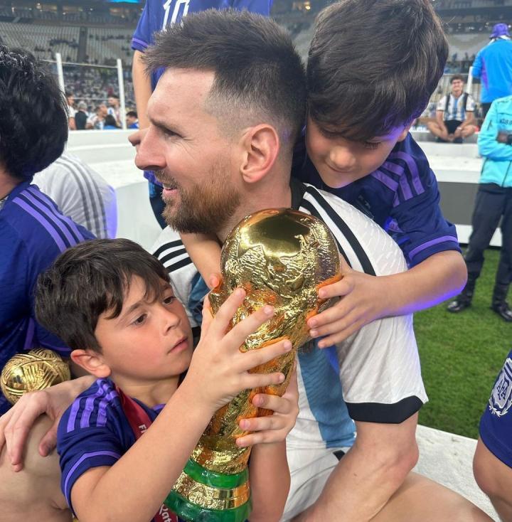 梅西妻子安东内拉晒照,两个儿子环绕着梅西并把玩着大力神杯。