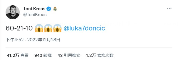 不过在克罗斯的留言下面,很少有人谈论东契奇的这次史诗级别的数据,反而是众多皇马球迷纷纷留言请求克罗斯尽快续约,有较为激动的球迷留言道:“签下那该死的合同,托尼!”
