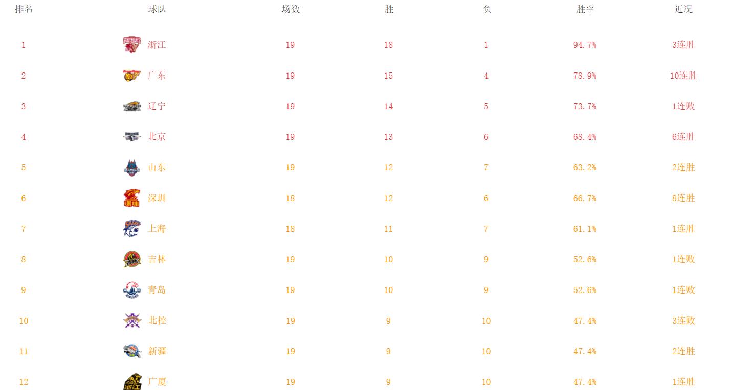 第一名浙江队目前战绩为18胜1负,他们至今仅仅输了一场球,而且还领先第二名广东队3场球,这差距是非常明显的。浙江队新赛季非常强势,赢球的基础还是阵容实力。现在的浙江队有吴前、王奕博、陆文博等国手,年轻球员有余嘉豪这样的超级新星。还有浙江队是拥有双外援的,这支队伍的实力达到顶峰。至于之前输广东队也是有原因的,因为当时多名主力无法出场。浙江队积分榜的第一位置很稳,除非遭遇长的连败。