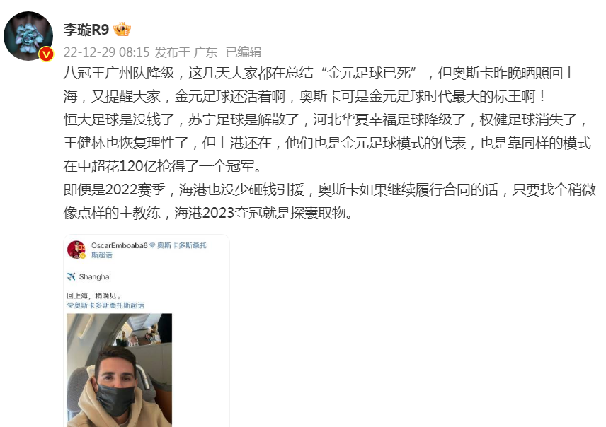 近日,足球报国内部主任李璇在个人社交平台上反驳了所谓“金元足球已死”的观点,认为代表“金元足球”的上港依然健在,表明“金元足球”并没有在中超消失。