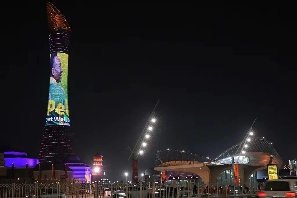 卡塔尔建筑点亮为贝利祈福。图/视觉中国