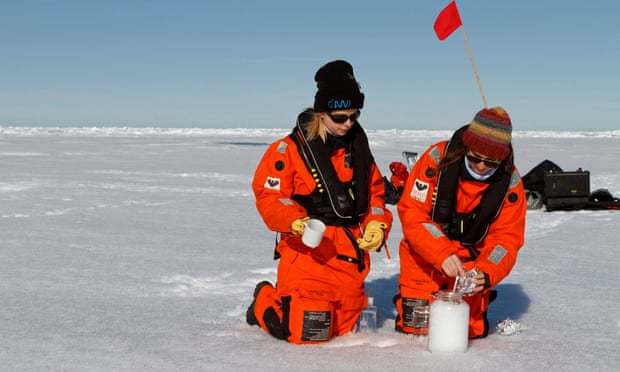 △来自极地号破冰船的研究人员正在收集北极海冰的雪样本。图据《卫报》