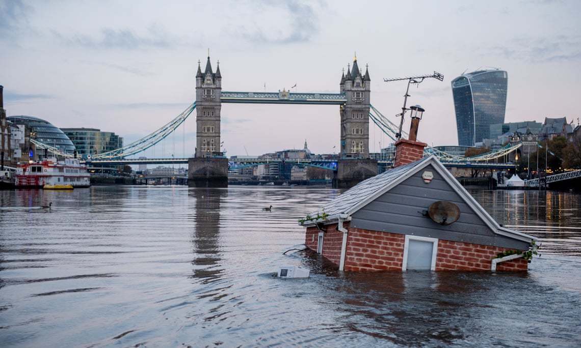 △11月10日,伦敦塔桥旁的泰晤士河上,一所环保活动人士用于抗议的房屋模型。图据《卫报》