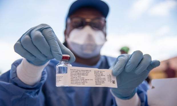 △刚果(金)姆班达卡,一名世卫组织护士携带的一瓶埃博拉疫苗。图据《卫报》
