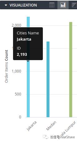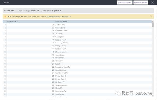 例如,当您单击图表中的列时,将钻取相应的度量“订单项计数”,并触发其钻取字段(“产品ID”和“产品名称”),并返回新的结果集: