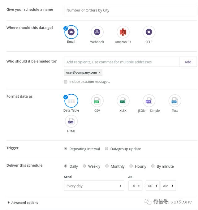 Looker 提供了不错的数据交付内容,如下面的截图所示。您可以通过电子邮件,webhooks,Amazon S3 或 SFTP 服务器发送数据结果。