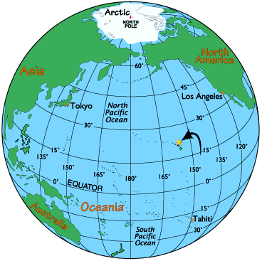 从夏威夷的纬度(看箭头),或更南处,你能在12月末和1月初,于日出前看见南十字座。地图来自 WorldAtlas。