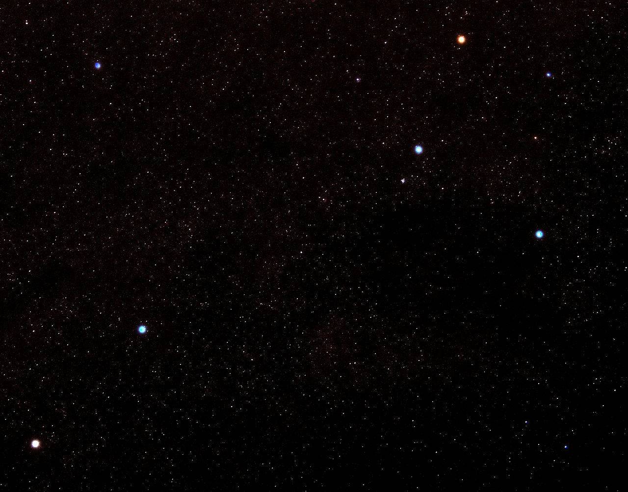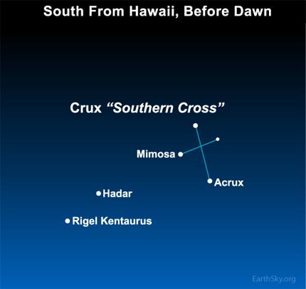 在夏威夷以南,现在就能在黎明前看见南十字座、参宿七和哈达尔都在更高的天空。从澳大利亚或新西兰——或南美或南非——十字星是在极地附近的。也就是说,它绕着天空的南极旋转,即使不是全部,也会在大多数夜晚出现。