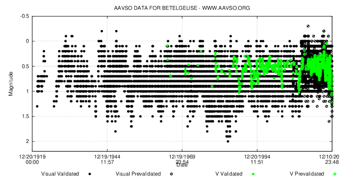 图解:关于参宿四的“历史性”变暗,这里是来自AAVSO数据库的过去一个世纪的v波段和光可见强度估算。 你试着在木星轨道范围内保持恒定的亮度和太阳质量,对流和核合成是3D的 - EricMamajek (@EricMamajek) 2019年12月21日