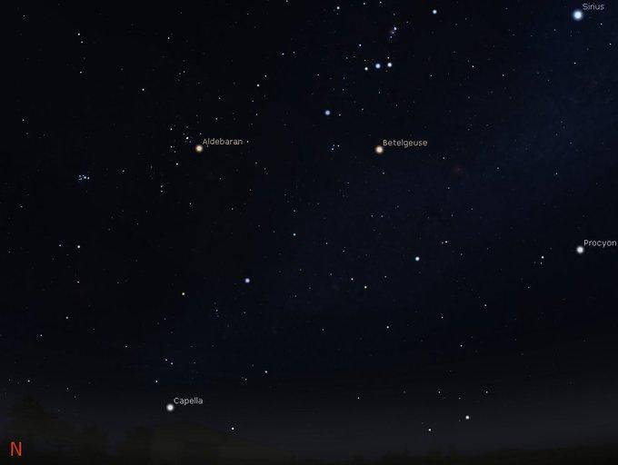 图解:从占星角度来看,参宿四更加黯淡了。历史上就有的参宿四变暗仍在继续,现在居然比毕宿五还黯淡了?它会继续变暗吗?我们正在观望。——伊恩·马斯格雷夫,2019年12月20日。