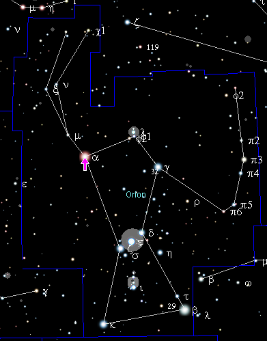 图解:在左边的粉红色箭头指示出参宿四在猎户座的位置。