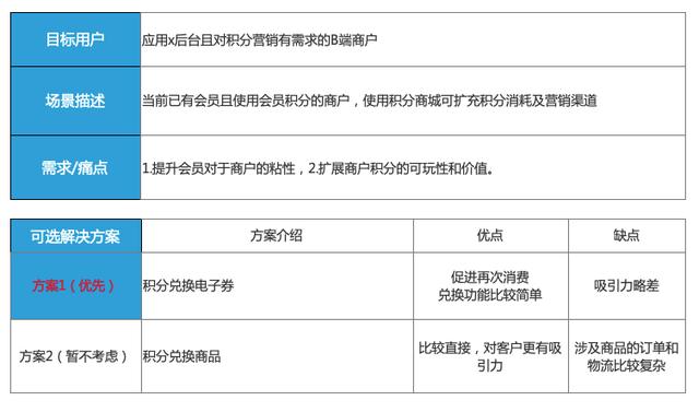 我们明确积分商城的目的是增强营销环节,增加客户粘性,那常见的积分兑换就是电子券和商品,考虑到商品涉及订单和物流,相对比较复杂,可以先做电子券的兑换,此次需求评审就是针对积分兑换电子券的方案。
