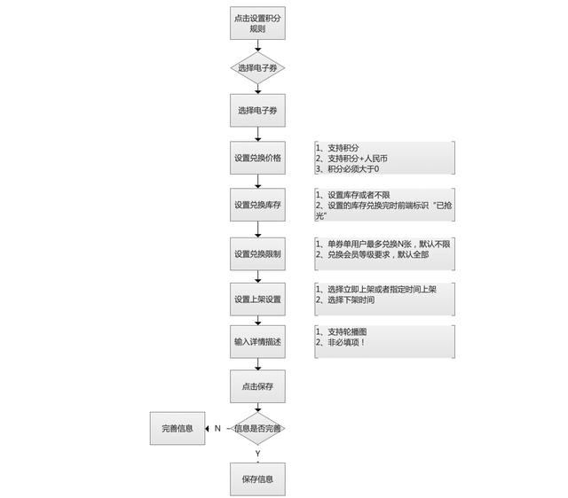 比如说积分规则设置的流程图:活动设置的时候需要考虑兑换价格,总数量,每人兑换上限,上下架等情况。如下面的流程图就能比较清晰地看出重要的业务规则点。