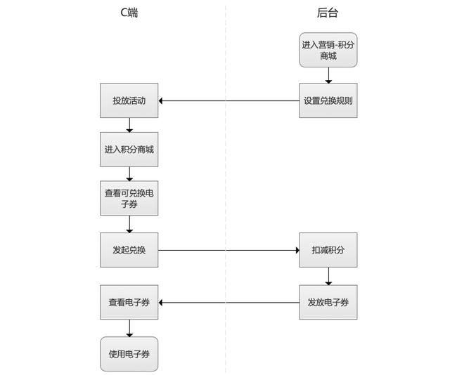 先画出一个多方角色的完整流程图,就像是在讲述一个完整的故事:商家在后台创建积分兑换活动,投放到C端积分商城上面,客户在商城上面找到自己想要兑换的电子券,发起兑换,扣减积分的同时获得电子券,获得后可在购物时直接抵扣。