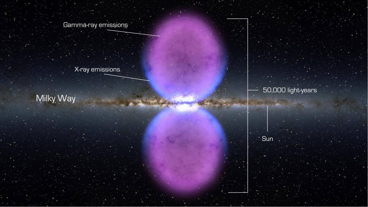 从头到尾,这个最新发现的伽马射线气泡延伸了50000光年,也可以说它约有银河系直径的一半那么长,我们可以用这个图片来说明(美国国家航空和宇宙航行局-哥达德太空飞行中心)