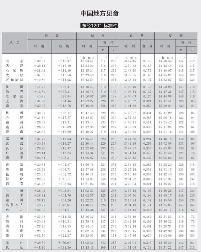 “10时56分左右月亮半影进入我国西藏阿里地区,而后月亮半影向东北上扫过中国全境,我国均可看到不同程度的日偏食,其中,海南食分最大,为0.499;漠河食分最小,为0.021。15时37分后月亮半影由海南省离开我国,对我国来说,可见日食时间历时4个多小时。”史志成说。