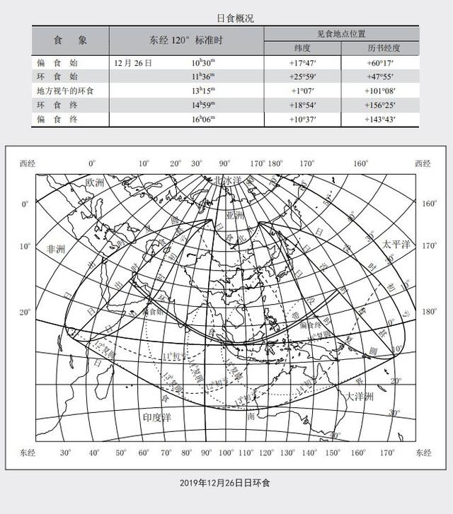 中国天文学会会员、天津市天文学会理事史志成介绍说,此次日环食将于北京时间26日10时29分50秒开始,至16时05分43秒终止,历经5个多小时。环食带从中东地区开始,经印度南端、斯里兰卡,进入东南亚的印度尼西亚、新加坡、马来西亚等国,最后结束于西太平洋上。这次的环食带平均宽度在115千米左右,见食地最长时间可以看到3分40秒左右的环食。