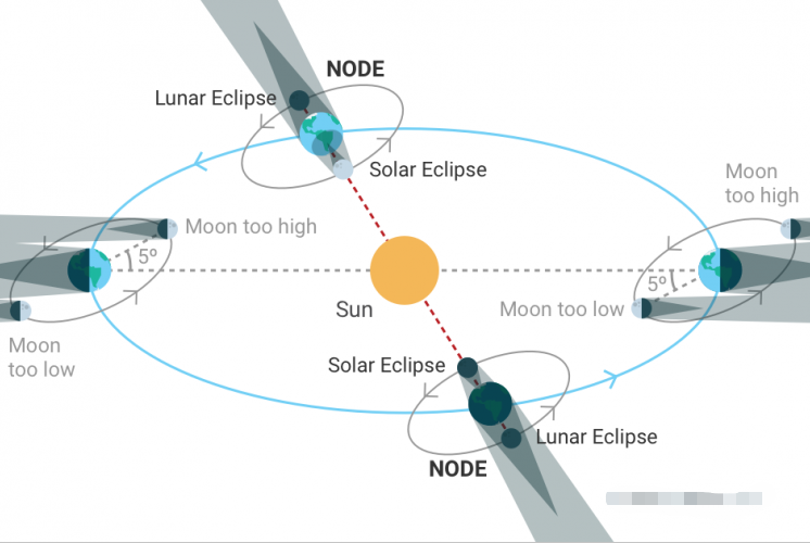 图解:接近地球公转轨道(黄道)月球公转轨道(白道)交点,黄白道交点是月球轨道与地球运行的黄道的交点。
