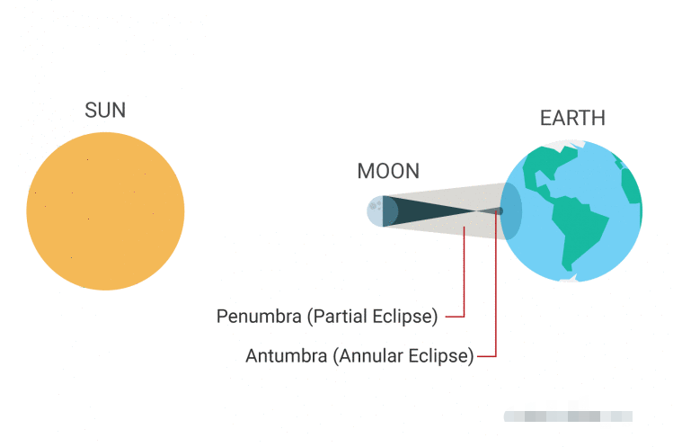 日食是由月球在地球上的投影引起的。目前知道的新月可以在地球上形成的投影有三种:本影、半影和伪本影。