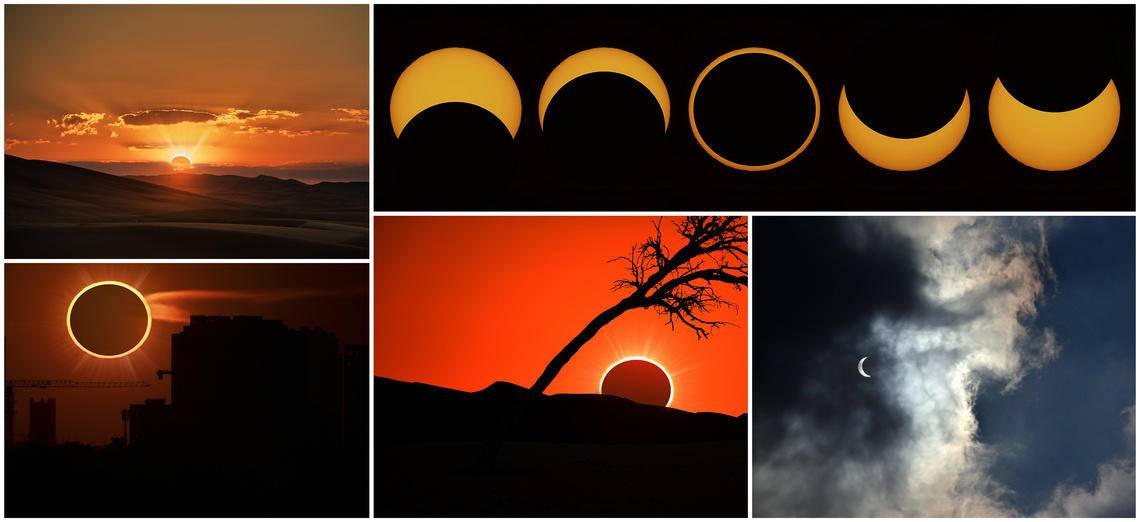 当日环食发生时,月亮覆盖太阳的中心,只留下太阳可见的外缘,在月亮周围形成一个“火环”或环形的形状。