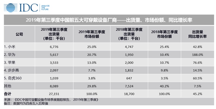 12月25日消息 昨日IDC发布《中国可穿戴设备市场季度跟踪报告,2019年第三季度》,显示2019年Q3中国可穿戴设备市场出货量为2715万台,同比增长45.2%。