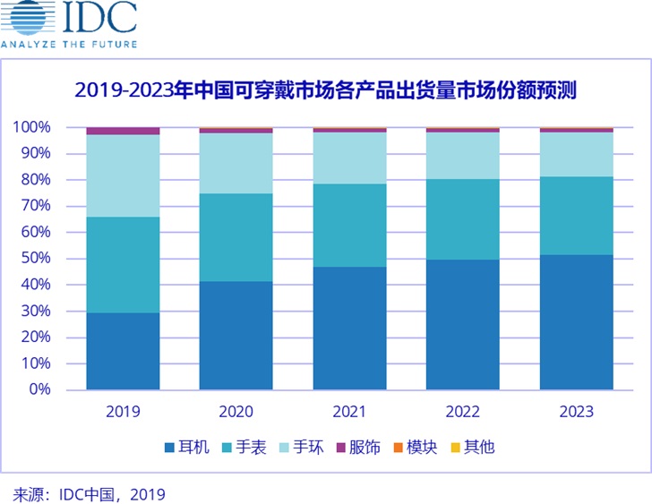 IDC也对未来5年的市场进行预测,据报告显示到2023年,中国可穿戴设备市场出货量将接近2亿台。产品方面,耳戴式可穿戴设备和腕式可穿戴设备(手环和手表)未来将并列成为市场上的主流形态,且耳戴式可穿戴设备未来将占据整体市场的一半。