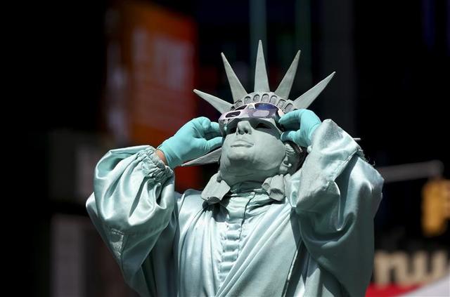 2017年8月21日,在纽约时报广场,一名装扮成自由女神像的男子观看日食。新华社 发