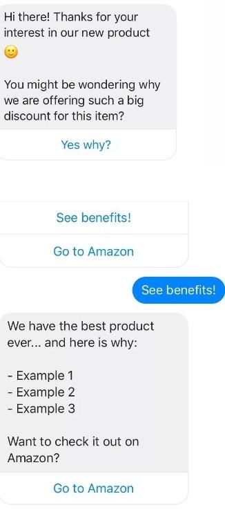 Facebook Bot是与你的客户群主动互动的好方法。数据表明,人们的点开率为90%。交互式消息在购买之前建立了联系和开放的沟通渠道,并能刺激初期的销量。购买后,你可以提供其他价值以激发评价。这就是这种策略解决获取评价鸡与蛋难题的方式。