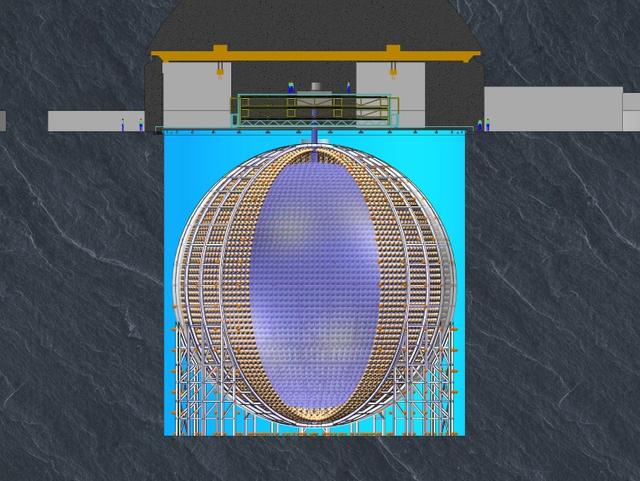 他们将把一个直径达35.4米的有机玻璃球安装在广东省江门市西南部的打石山中。施工人员已经在700多米深的花岗岩下方挖出一个空洞,作为未来的实验大厅。