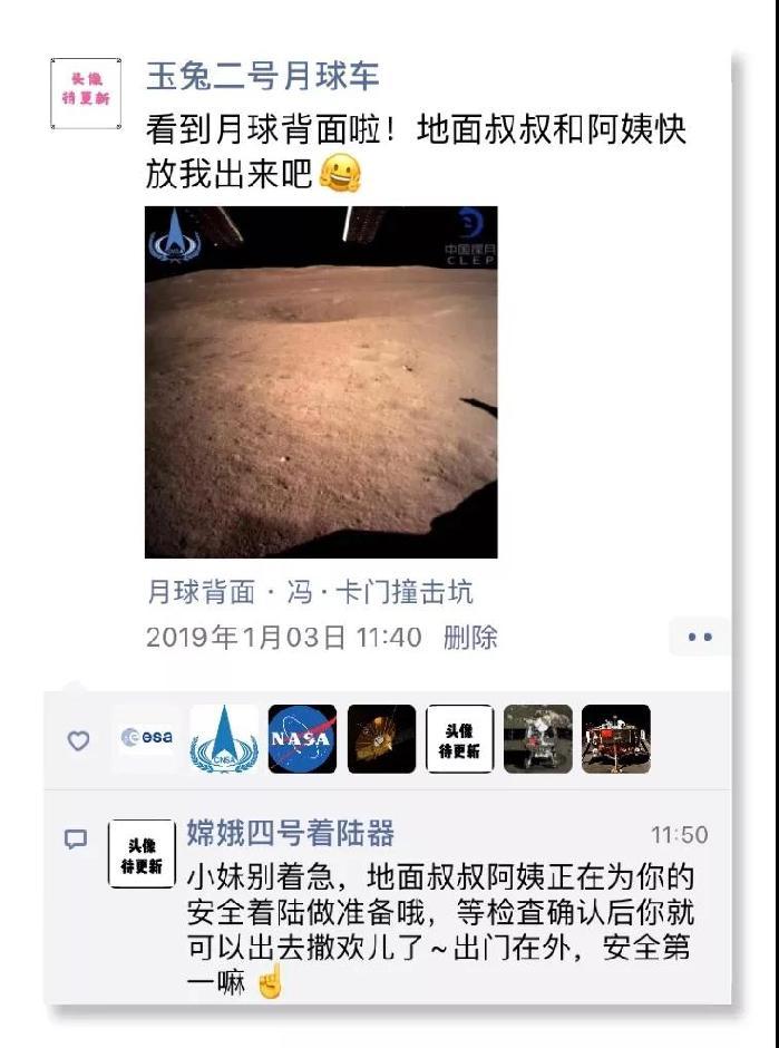 “成功了!成功了!”当我们降落的那一刻,我听到来自地球上的一片欢呼声。我和四哥收到了来自四面八方的祝福,美国国家航天局、欧洲航天局还有我们亲爱的中国航天局等各大航天机构纷纷向我们发来贺电,地球上媒体纷纷报道:“中国嫦娥四号代表全人类首次实现月球背面软着陆!”说起这些不免有点小骄傲呢。