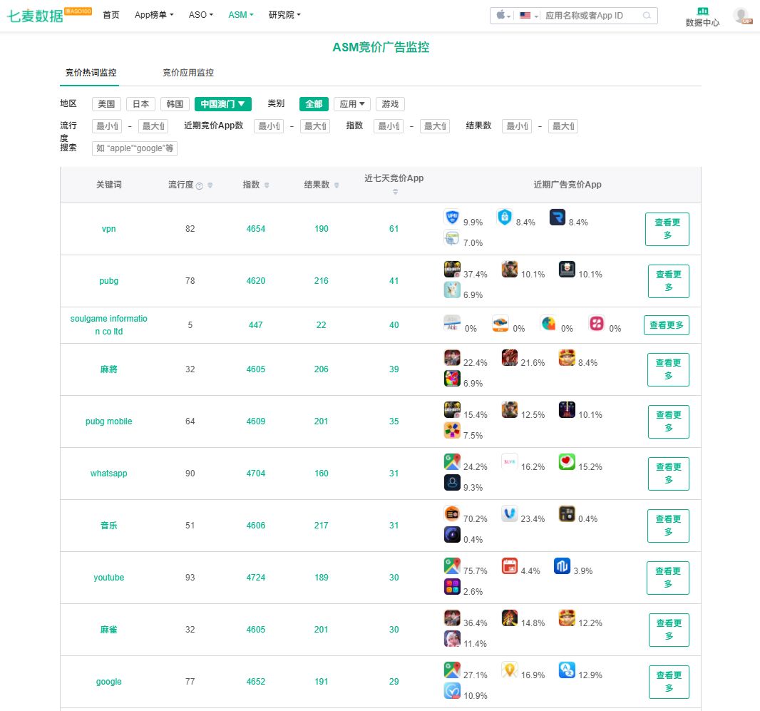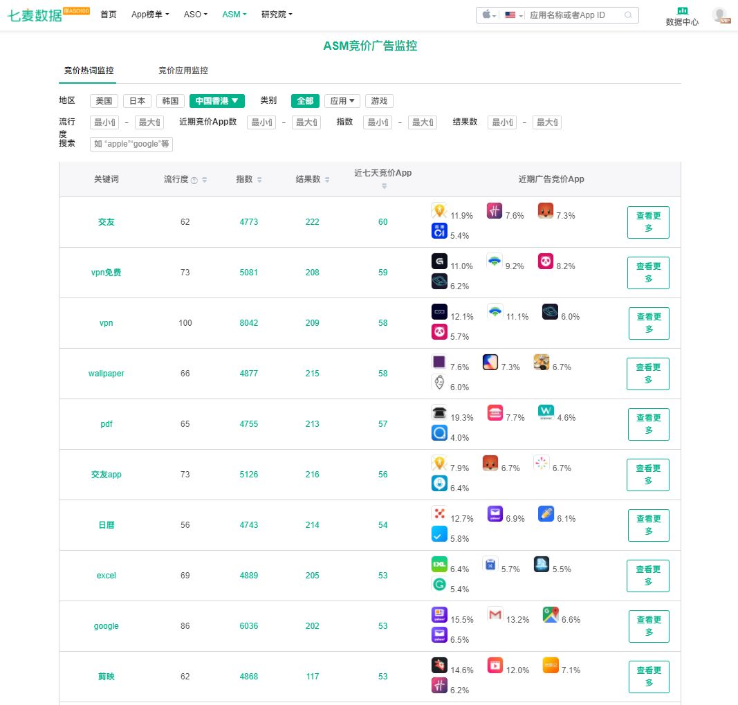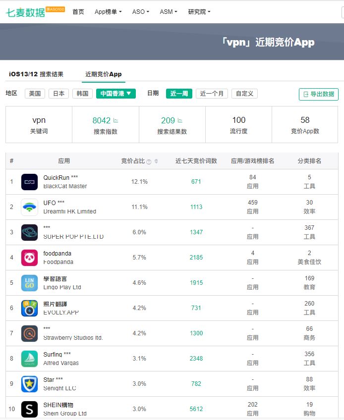 在七麦数据官网可以查看到港澳台近 7 天内的竞价热词,我们截取了各地区的 Top10 热词,其中 VPN 的行业词和相关词在港澳台的竞争最为激烈,单看香港就有 2835 个产品(未去重)都投放了与 VPN 有关的关键词。