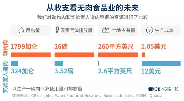 虽然在实验室制作人造肉的生产过程中,水量使用、土地占用和温室气体排放量这三者相比传统饲养等环节给环境带来了巨大的益处;但是,无肉制品每磅的成本依然要比传统肉制品高了许多。下图是具体的数据对比: