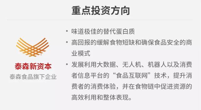此外,各大公司旗下的基金也越来越重视肉类替代品生产与创新领域,例如泰森食品(Tyson Ventures)下属的投资公司——泰森新资本。其早在2016 年 10 月便对 Beyond Meat 进行了第一笔投资。2017 年,Beyond Meat 在 G 轮融资中获得了 5500 万美元,泰森新资本就是参投机构之一。