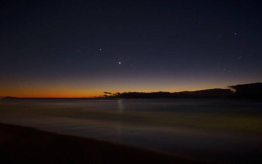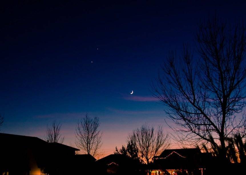 火星总是极易于夜空中被发现。但是,没有什么比看到它与另一个天体的近距离接触更让人振奋。在1月20日黎明前的清晨,你可以看到火星移动至弯弯的月牙2度11分的范围内。他们将在当地早晨4点左右,在这个腊月的早晨太阳升起之前,一起双双露面,。