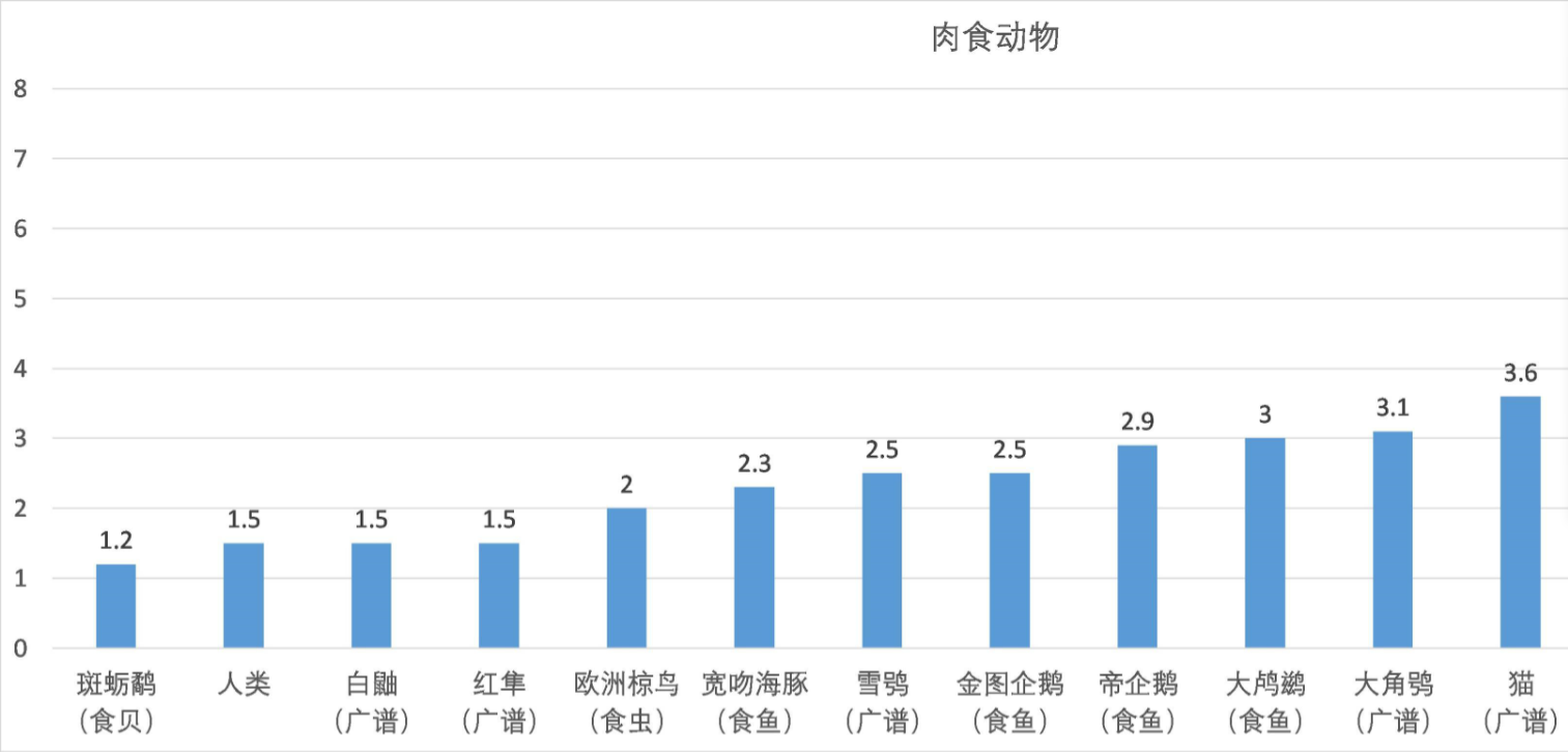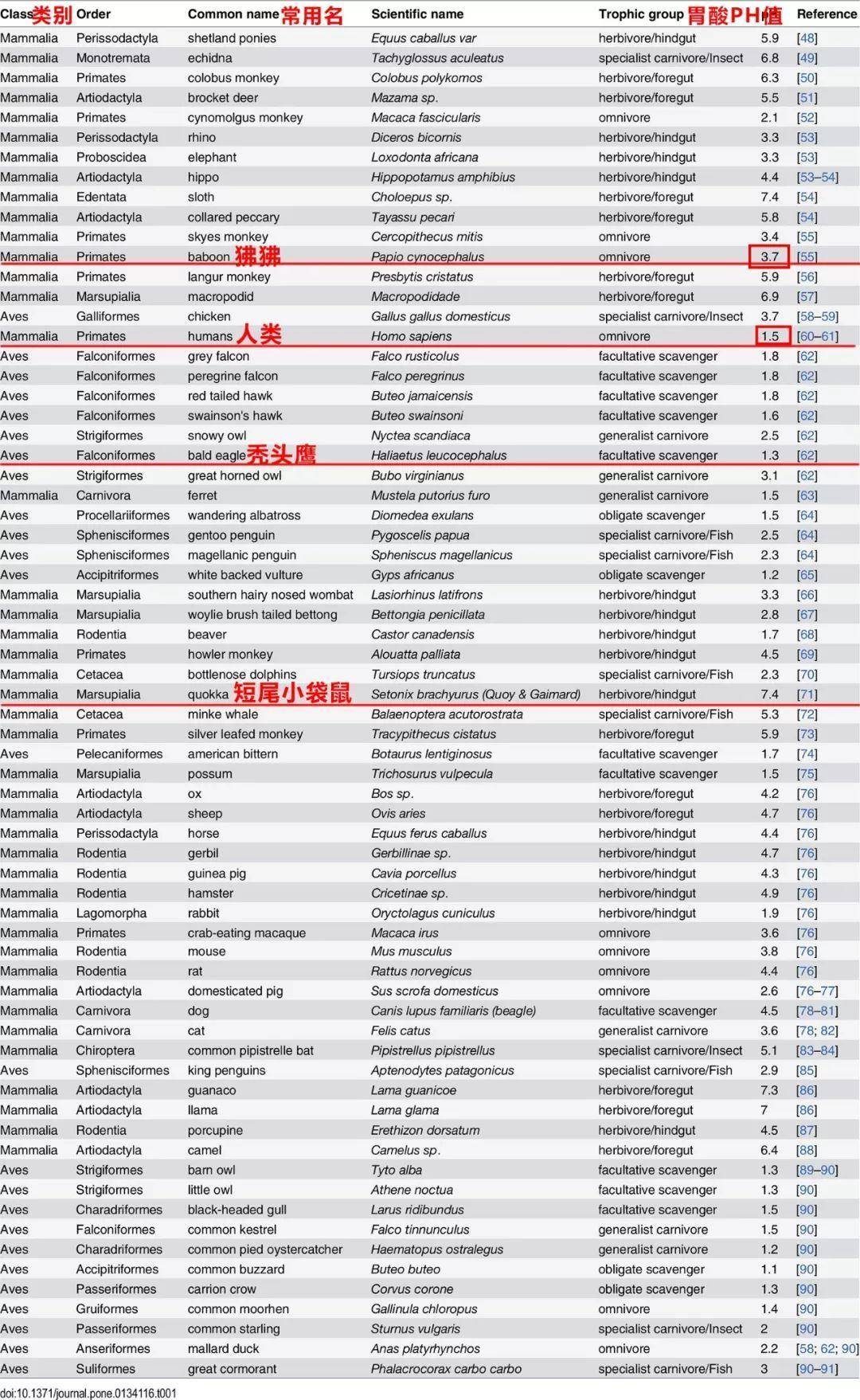 而食腐动物更厉害,它们的胃酸比食肉动物更低,比如下图中,人类的胃酸PH值为1.5,食草动物短尾小袋鼠的胃酸PH值为1.4,而食腐动物秃头鹰的胃酸,PH值达到了1.3,在这个表格中,胃酸最低的是普通鵟,它的胃酸PH指大约是1.1,比人类的胃酸还要低。