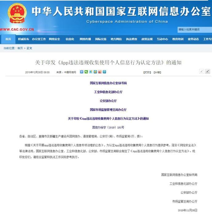 中新网客户端北京12月30日电(记者 吴涛)近日,国家互联网信息办公室、工业和信息化部、公安部、市场监管总局联合制定了《App违法违规收集使用个人信息行为认定方法》,有以下行为可被认定为违法违规收集使用个人信息。